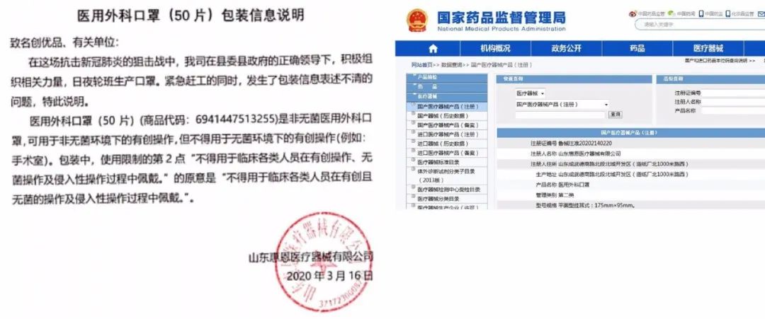 同时,对方也指出,该批产品外包装上原印刷日期“20200306”系定制包装时失误导致的印刷错误,实际以标签覆盖的“20200303”及“20200302”为准。山东惠恩医疗器械有限公司拥有山东省许可的医疗器械生产资质。该批次医用外科口罩已于2020年2月28日注册备案,注册证编号为“鲁械注准20202140220”,具体可在国家药品监督管理局网站查询。