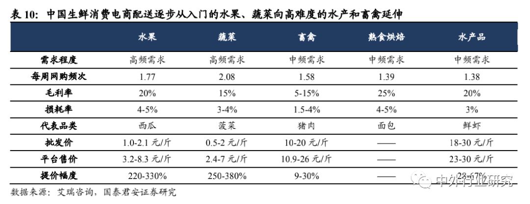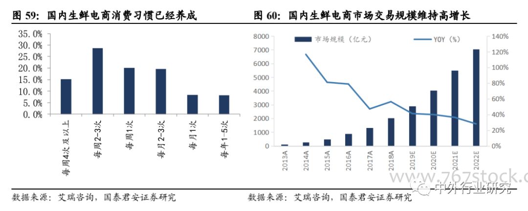 网购生鲜消费习惯已经形成,生鲜电商市场仍呈高增长趋势,品类逐步从配送难度小的水果、蔬菜向配送难度高的水产和畜禽冰鲜延伸。