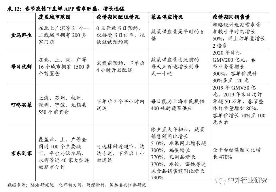 疫情期间,生鲜电商订单量激增,主要APP 流量和客单价大幅增长。