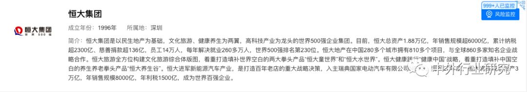 天眼查数据显示,恒大集团是以民生地产为基础,文化旅游、健康养生为两翼,高科技产业为龙头的世界500强企业集团。