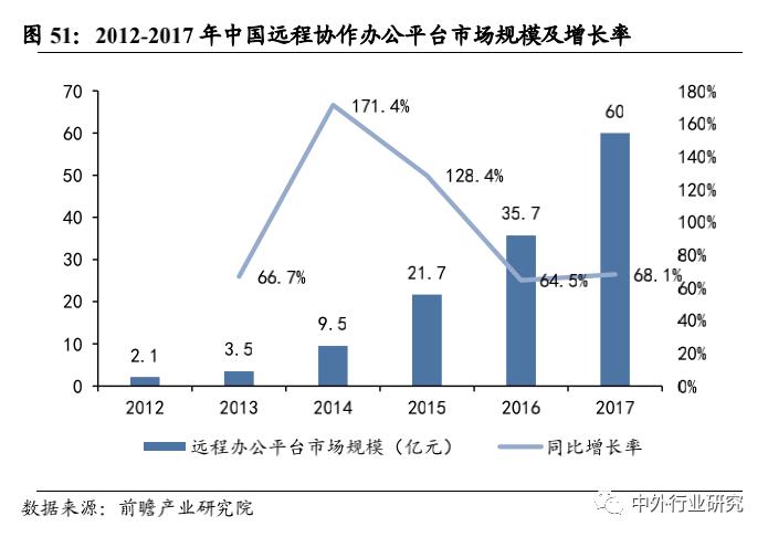 国泰君安证券分析师根据前瞻产业研究院统计数据显示,2012-2017 年,我国远程办公平台市场规模呈现较快的增长,2017 年远程办公规模达到 60 亿元,同比增长68.07%,2012-2017 年市场年均复合增速达到 95.52%。
