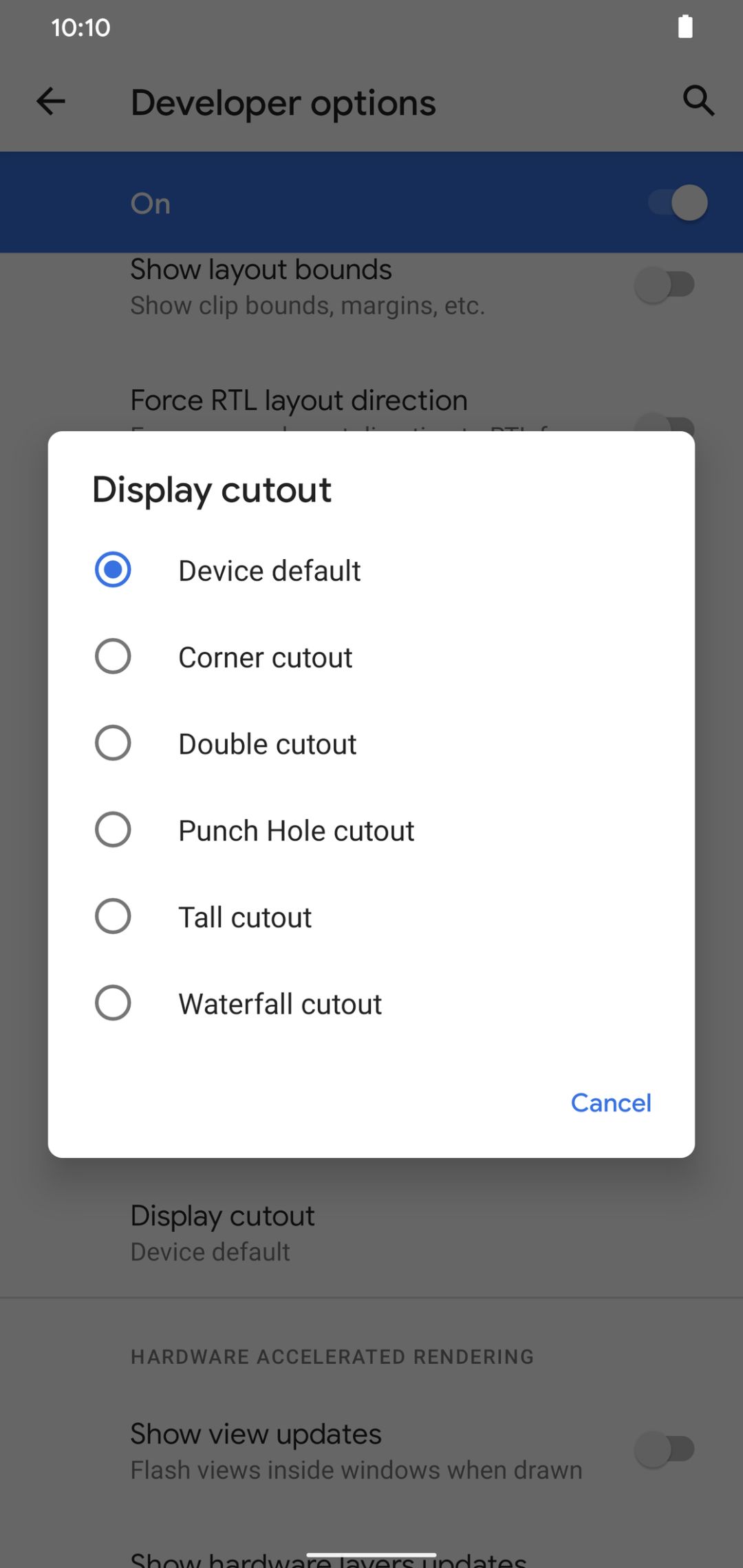 最后,为了帮助开发者更好地针对「日新月异」的屏幕形态进行应用适配,Android 11 DP2 还为开发者选项中「刘海屏模拟」功能引入了更多的屏幕模拟效果,包括打孔屏和瀑布屏。如果说最初这个功能算是提前「曝光」了 Pixel 3 XL 的刘海屏设计,这次的打孔屏支持似乎则可以被看作是对 Pixel 4a 的一次「暗示」了。