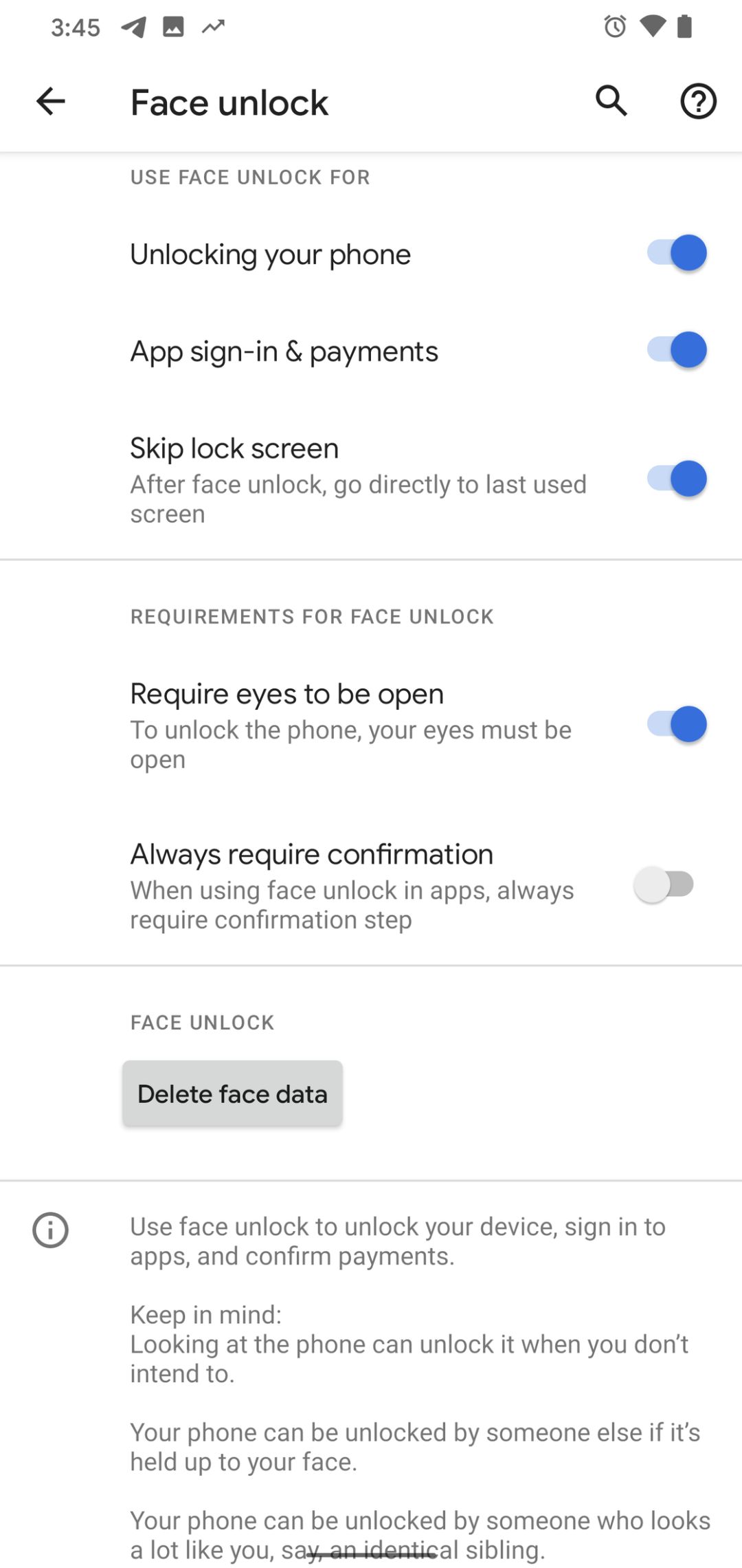 好在 Android 11 DP2 更新之后,相关选项终于出现在了面部解锁的设置界面当中。在「系统设置 > 安全 > 面部解锁」中,Google 为 Pixel 4 新增了一项名为「要求睁眼(Require eyes to be open)」的额外验证开关 ,开启后 Pixel 4 会在面部解锁过程中同时检测用户是否为睁眼状态,经过我们的实际测试,现在闭着眼睛确实不能解锁手机了。