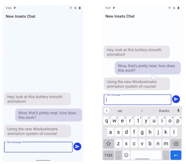 借助 Android 11 DP2 引入的两个 API 接口——边衬区动画监听器(Insets Animation Listener)与窗口动画控制器(WindowInsets Animation Controller),Android 11 DP2 还为每天都要与我们打交道的输入法键盘带来了新的过渡动画。