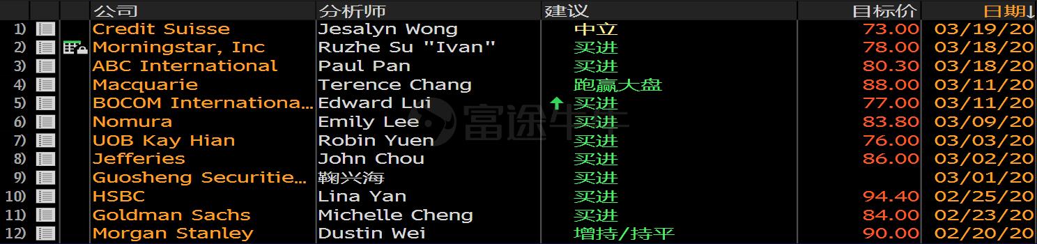 在评级分析上,41位分析师中有39位都给出了「买进」评级,对应12个月目标价为83.14元。
