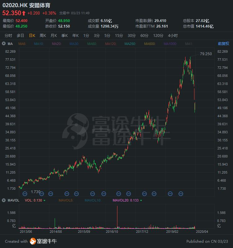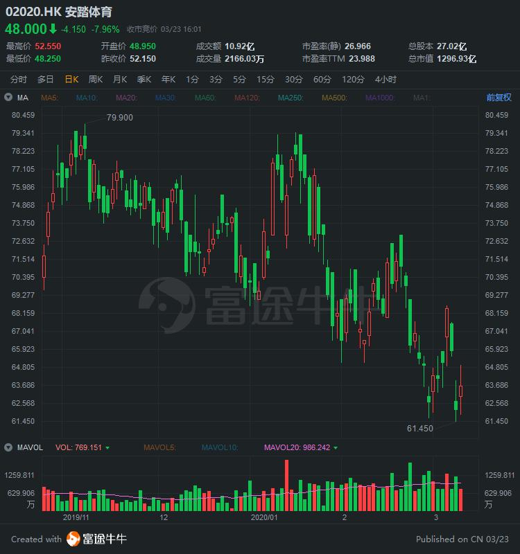 受疫情影响,大盘多次震荡,安踏股价也一路向下,截至3月23日收盘,安踏股价为48港元,较去年11月历史最高点79.9元跌幅高达40%。