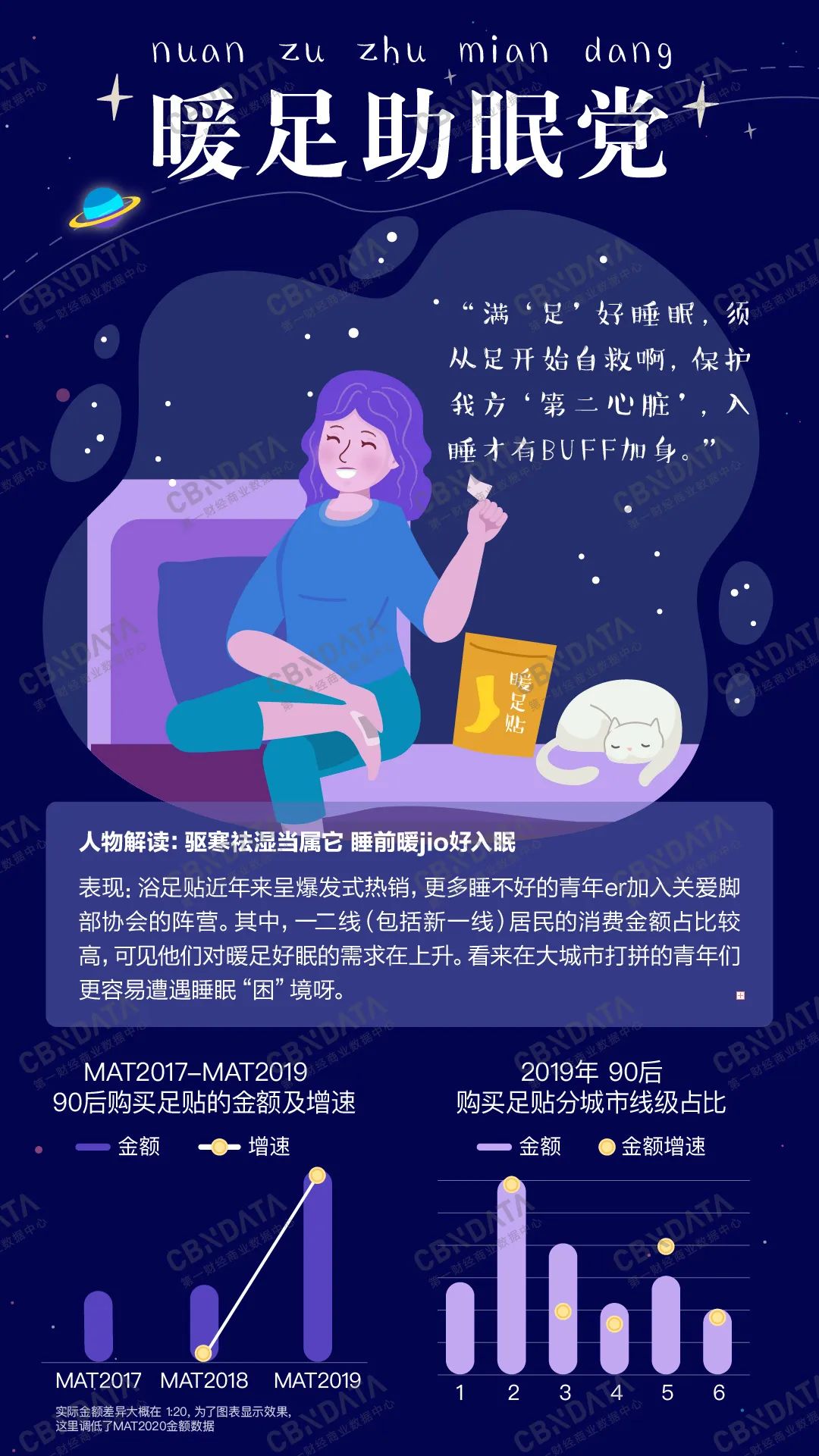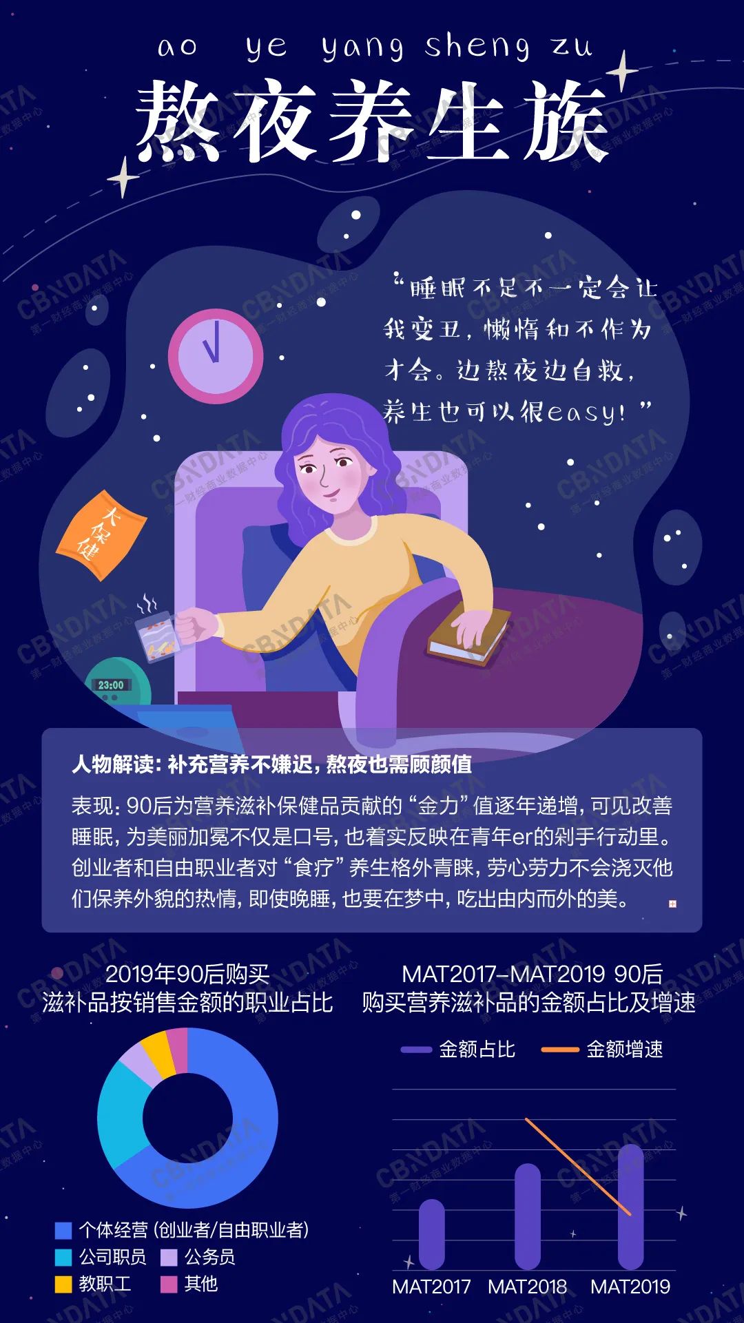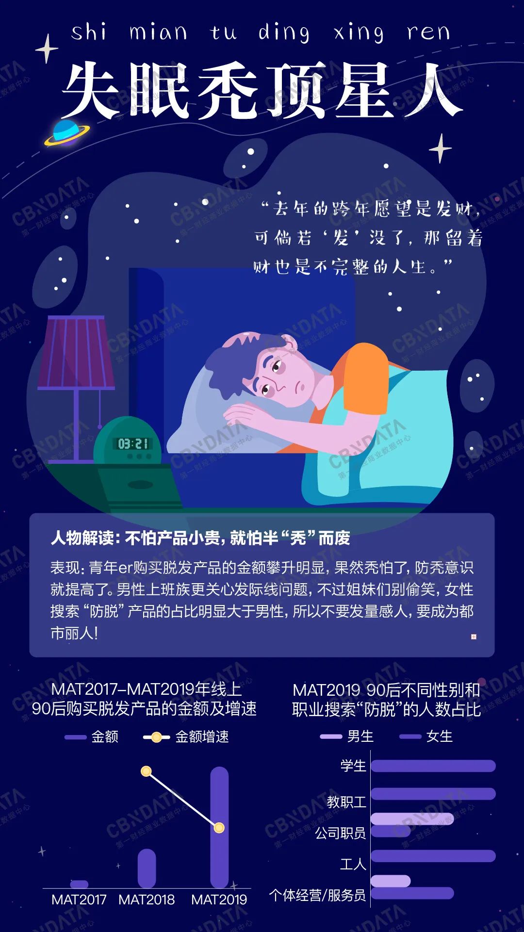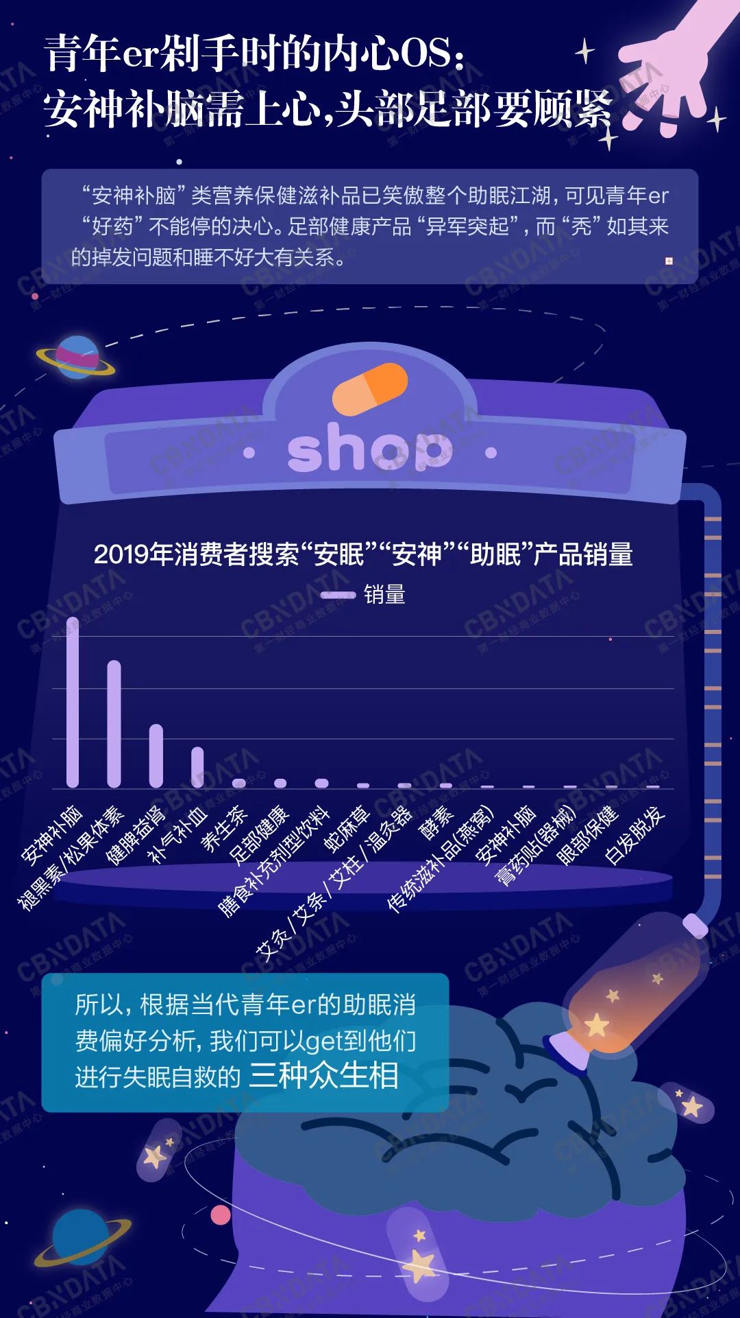 当代青年er的特点之一是善于自救。如果靠自己没办法提高睡眠质量,解决不了失眠带来的脱发、湿气等身体问题,那就靠剁手来帮助吧。根据《睡眠报告》,“安神补脑”类营养滋补品已经笑傲整个助眠江湖。而在五花八门的食补产品中,还出现了足部健康、脱发产品等,可见青年er已经从头到脚“补”得滴水不漏。