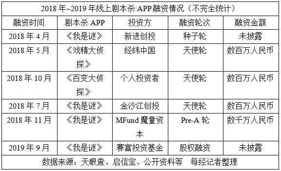 2018年可谓是剧本杀类产品的“融资元年”。据每经记者不完全统计,2018年至今,多个知名的线上剧本杀APP均有资本进入,融资金额从数百万人民币至数千万人民币不等。其中,头部APP《我是谜》在八个月完成了三轮融资。