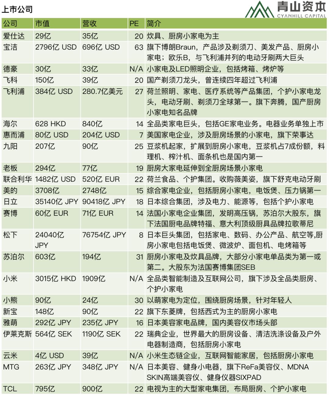 正如《青山资本2020中国快消品早期投资机会报告》中提到,厨房小家电市场在2000亿级别,近年始终保持10-15%的年增长,前三美的、苏泊尔和九阳三足鼎立,占据市场80%,但后来者不断涌入,如小熊等增长势头迅猛,上市半年市值已接近九阳的一半。新面向市场的品类广受欢迎,如破壁料理机(以超高转速集合了榨汁机、豆浆机、冰激凌机、料理机、研磨机等功能)单品类就超过百亿,增速50%。