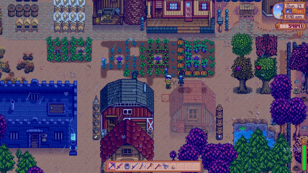 我玩《星露谷物语》的习惯是这样的:早上起床,给植物浇水施肥,放动物出栏,制作农副产品,找NPC送一圈礼物,去战斗和挖矿,一路要捡拾山货,最后在体力即将耗尽的状态下回家。为了不浪费每一天(现实中约13.5分钟),我要卡准时间,背熟路线。