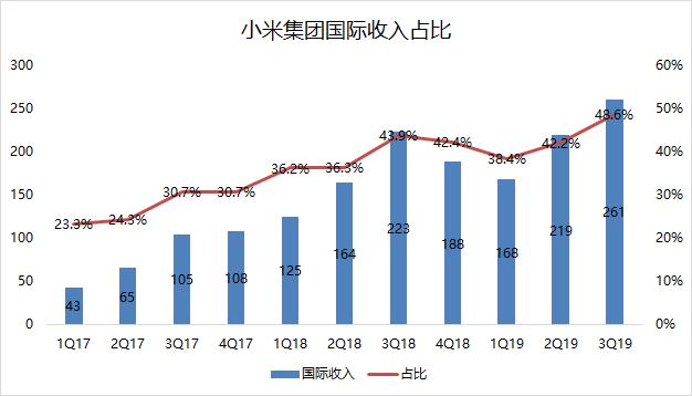数据显示,截至2019年第三季度,小米集团国际收入占比已经接近一半。