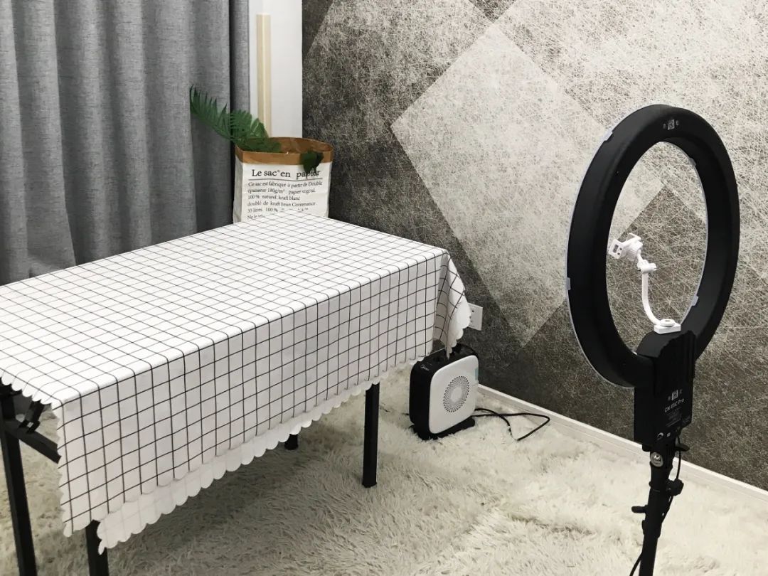 但是,按照我个人的经验来说,其实没多大必要。个人或商家自己布置一下,入门级的直播只要一部手机,一个支架,一张桌子就可以了。