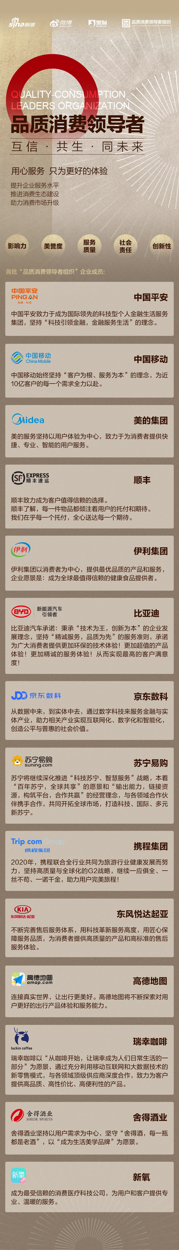 3月23日,由新浪网、微博发起,以黑猫消费者服务平台为依托的“品质消费领导者组织”宣布正式成立。该组织联合相关机构、媒体、律师以及在消费服务方面表现卓越的企业共同组建,组织成员践行用户为先理念,提升企业服务水平,推进消费生态建设,助力消费市场升级。作为中国值得信赖的消费者服务平台之一,截至2020年3月,黑猫投诉平台上已累计收到消费者有效投诉近140万余件,为中国数以万计的消费者提供了消费安全保障。首批入选的中国平安、中国移动、京东数科、新氧科技等十四家企业均是各个领域的领头羊,并且分别代表了中国经济发展的支柱型或前瞻型产业。