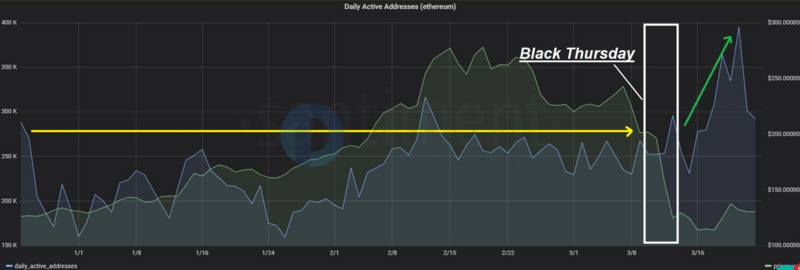 3月21日,以太坊网络上的每日活跃地址激增至39.5万。这种情况自2019年6月以来就没有出现过,当时ETH的价格触及了约336美元的年度高点。Santiment就此表示,对于以太坊的中长期前景来说,接近40万是一个很有希望的发展。(AMBCrypto)