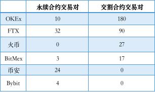 从交易对数量来看,OKEx 的交割合约数量最多,远超后五家总和。这也很好解释了,为何 OKEx 合约交易量超过 BitMex。