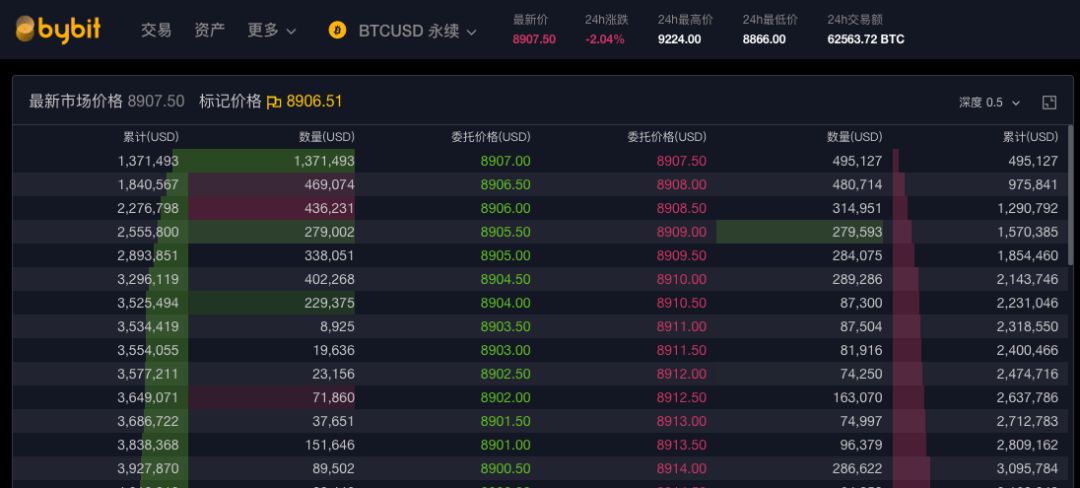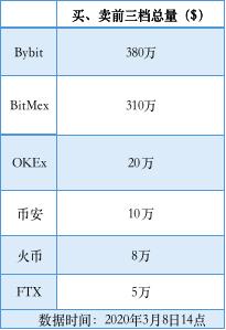 在一众交易所,Bybit 深度是最好的,买卖前三档分布均匀,总量可以达到 380 万美元;紧随其后的是 BitMex ,其深度同样达到百万量级。而火币、币安、OKEx 以及 FTX,在深度上实际上表现得并不尽如人意。