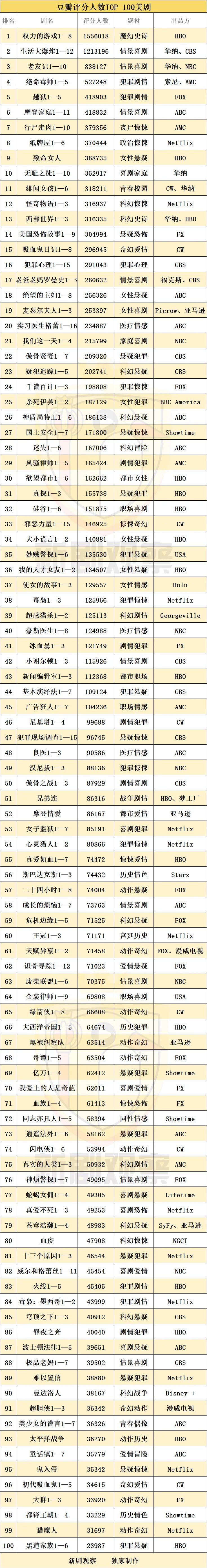 备注:(1)表格统计日期截至2020年3月23日;(2)季播剧所统计评分人数均为各季评分人数相加所得;(3)《破产姐妹》由华纳、CBS联合出品,但该剧为一个典型的英国故事,因此不计在表格所统计美剧范畴内;《全裸监督》《王国》为Netflix原创剧集,但按语言、主创团队划分,将两剧归为日剧、韩剧,同样不计在表格所统计美剧范畴内。其它剧集同理。