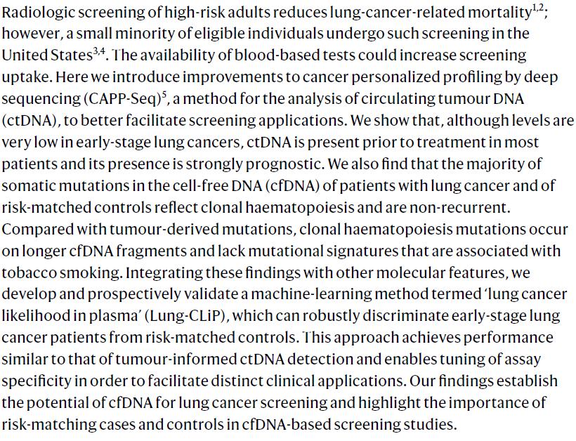 研究人员还发现,肺癌患者游离 DNA (cfDNA) 的大多数体细胞突变,反映的是克隆性造血突变(突变来自于白细胞),并且是非复发性的。与肿瘤衍生突变相比,克隆造血突变发生在较长的 cfDNA 片段上,并且缺乏与吸烟相关的突变特征。
