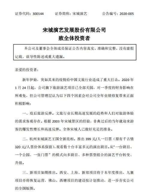 2月2日晚间,宋城演艺发展股份有限公司发布公告称:“新年伊始,突如其来的疫情给中国文旅行业造成了重大打击。2020年1月24日起,公司旗下旅游演艺项目已全部关园,对一季度的财务影响在所难免。”