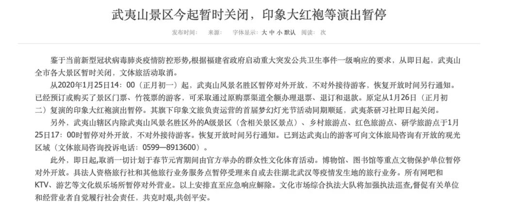武夷山风景名胜区同样在春节期间发布公告称:“原定从1月26日(正月初二)复演的印象大红袍演出暂停。其旗下印象文旅负责运营的首届梦幻灯光节活动同期顺延,武夷茶研习社即日起关闭。”
