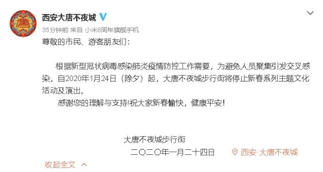 同日,大唐不夜城步行街、大唐芙蓉园、西安城墙等景区也发布通告,根据新型冠状病毒感染肺炎疫情防控工作需要,将停止相关活动、暂时闭园,《再回大雁塔》、《再回长安》等演出均被叫停。