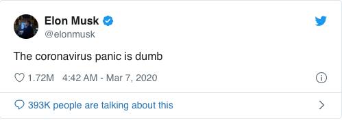马斯克是坚定的“无视病毒”派,他认为:“新型冠状病毒恐慌造成的伤害远远超过了病毒本身,感染病例绝不会超过人口的0.1%。我会亲自去上班,但那只是对我而言。”