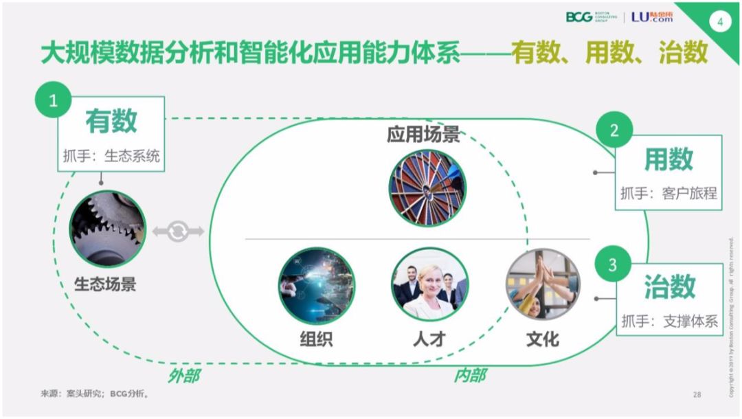 “有数”意味着构建更多场景并连接场景,通过打造开放生态获取更多海量、多维度、相关度高的数据;“用数”需要从审视客户价值主张出发,开展端到端、全方位的客户旅程重塑;而“治数”就对机构支撑体系提出了新要求。