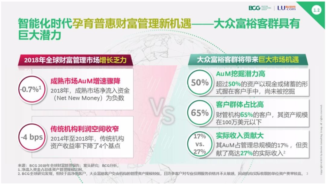 近日BCG联合陆金所共同发布《全球数字财富管理报告2019-2020》预测,智能化必将成为下一个十年全球财富管理行业发展的重要方向,并为财富管理市场带来全新机遇和巨大的市场潜力,“让各类机构实现15-30%的收入提升及25-50%利润,整个财富管理市场资产管理规模实现25-50%的增长”。