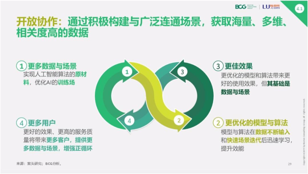 因此,对于传统机构来说,在已有的智能化行动之外,未来还需要更加体系化地构建核心能力。报告提出,首先,数据与场景尤其是相关度高的数据与场景远比算法本身更重要,传统机构应秉持开放协作的理念,通过积极构建、广泛连通场景,来获取源源不断的数据。