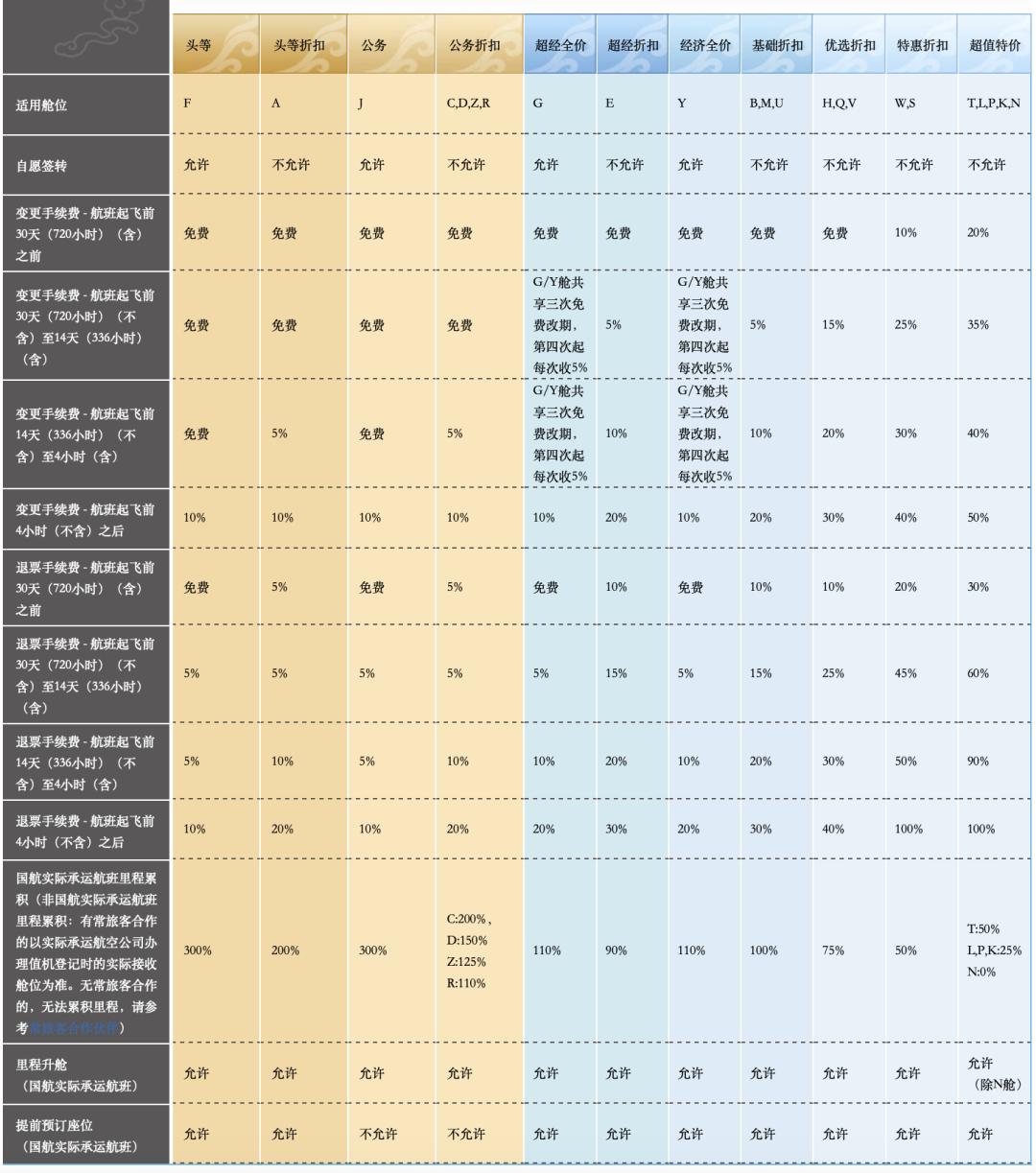 第三方代理商,指的是在OTA平台上规模各异的代理商们,他们从航司处接到机票代理,然后通过携程、去哪儿这样的OTA平台推至用户。在这一渠道中,代理商通过两种价格拿到票:公开运价和私有运价。公开运价包括退票手续费比例都是公开的,比如全票机票享受三次免费改期,第四次起每次收取5%的手续费,而像T,L,P,K,N这样的超值特价舱位价格收取20%-100%的费用,下图以国航为例: