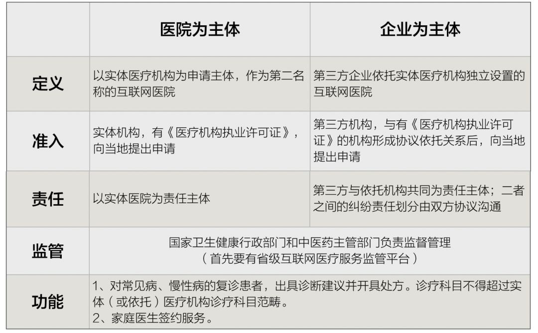 互联网医院有两类,即以「医院为主」和「企业为主」。互联网医院出现后,两类互联网医院的区别就一直是争议的热点。