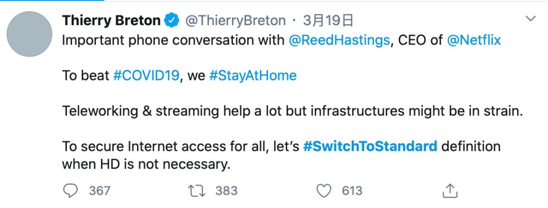 3 月 19 日,欧盟内部市场官员 Thierry Breton 在推特上发出 #SwitchToStandard 的话题,呼吁欧洲用户调整流媒体的使用习惯,把视频清晰度从「高清」调整到「标准」,以确保网络能正常访问。