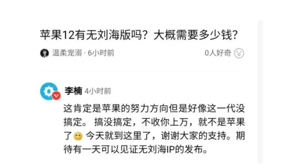 对于iPhone是否有刘海这个问题,前魅族副总裁李楠表示,干掉iPhone的刘海是苹果努力的方向,但是iPhone 12系列貌似没搞定,即便iPhone真的没有了刘海,那价格肯定会破万,这才符合苹果一贯的风格。