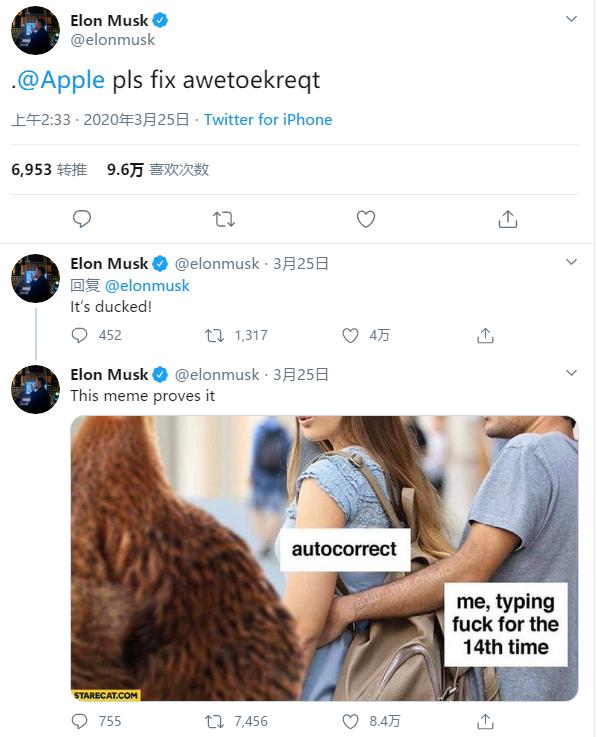 3月27日消息,特斯拉CEO马斯克近日在推特上对苹果发起了吐槽,其认为iPhone中iOS系统提供苹果输入法不太好用,特别是自动纠正功能。