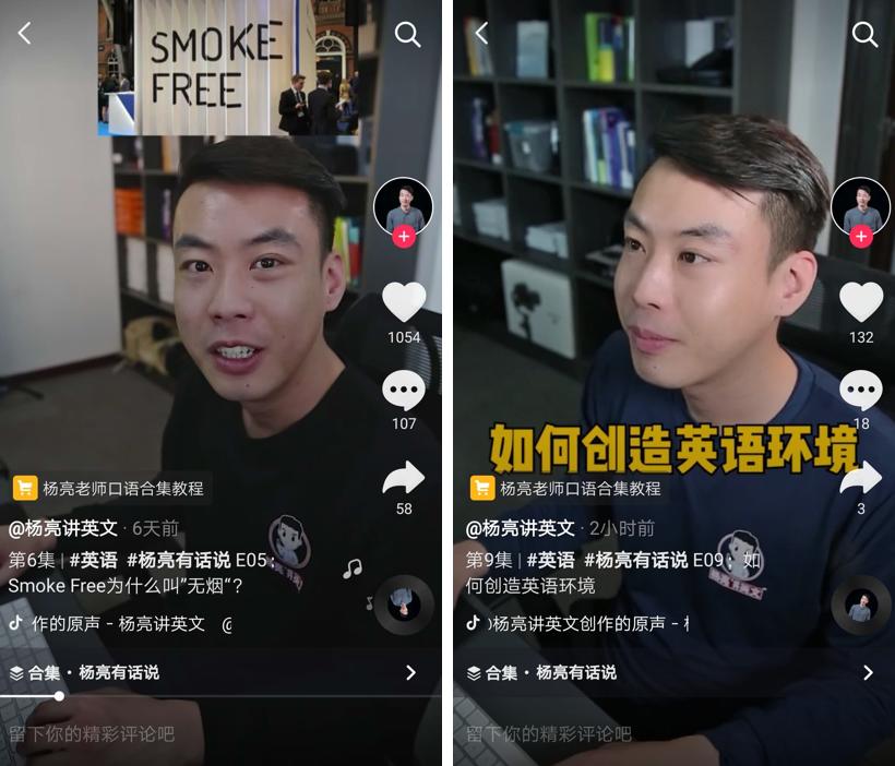 比如说在抖音上卖英语课的@杨亮讲英语 ,他的视频基本上都会创造一个英语使用的场景,将某个知识点融入进去,以别出心裁的方式将知识点讲透。