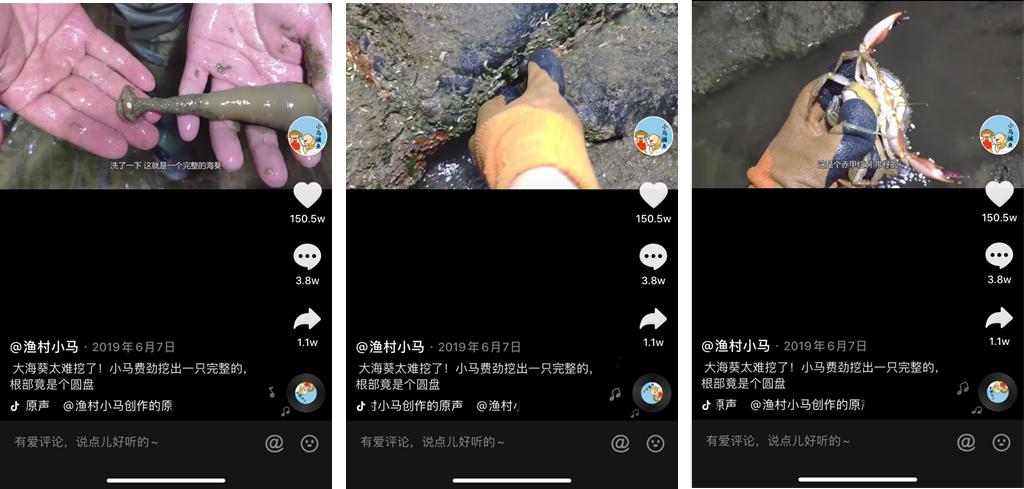 再比如卖生蚝月入 20 万的@渔村小马 会不定期直播赶海,在岩石里挖海螺,在海滩挖海葵、挖螃蟹等,为用户还原一个真实的赶海经历,让大家像看养成类节目一样有获得感。