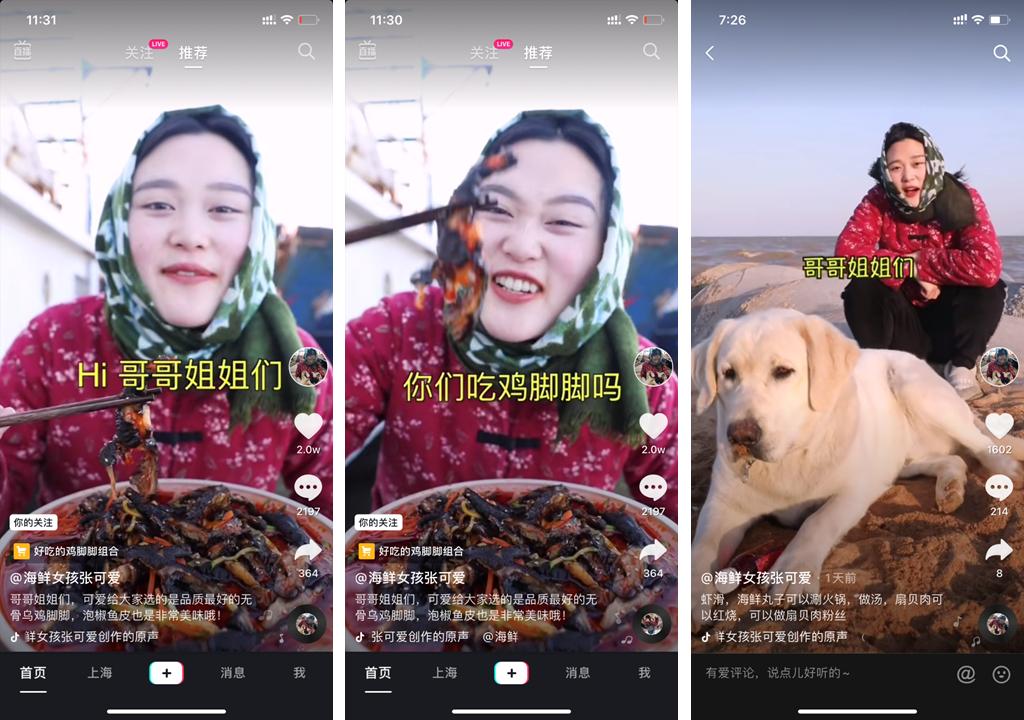 关于这一点,我们可以学习@海鲜女孩张可爱 在拍短视频的时候用的一个技巧: