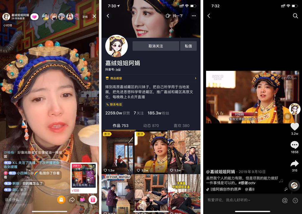 再比如曾经放弃国外年薪百万的工作,嫁到西藏的一个小山村,利用直播带货帮助当地 500 多户脱贫的@嘉绒姐姐阿娟,让更多人通过直播了解到了西藏的风景和独特的文化,通过展现少数民族特色吸引到了很多人的关注,还曾被央视点赞。