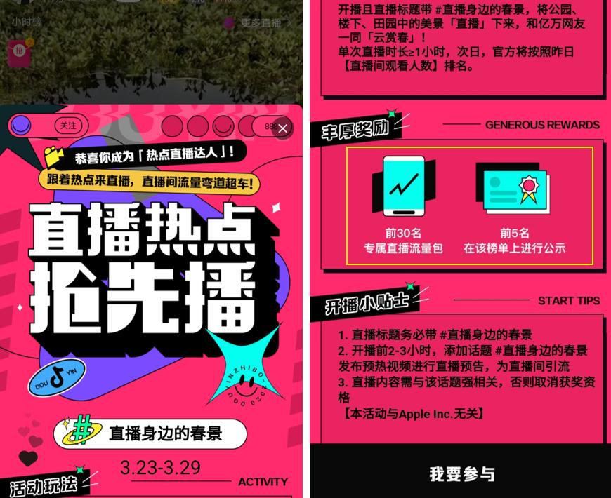 比如说前几天,抖音就举办了一个直播热点话题 #直播身边的春景。给出的最终奖励是: