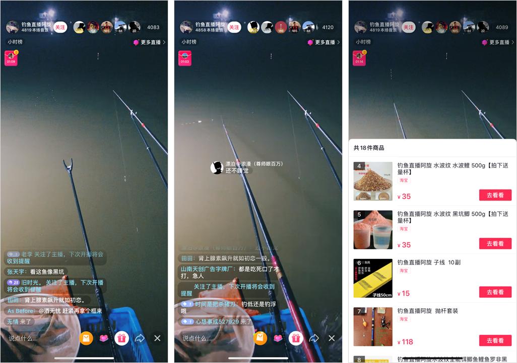 再比如卖鱼竿的主播会经常直播钓鱼,并在直播过程中展示鱼竿的性能,大晚上的直播间还有 4000 多人在看。