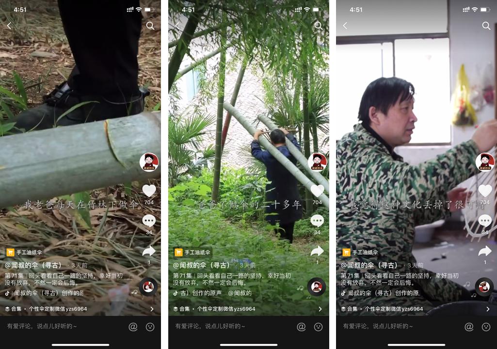 比如卖油纸伞月入十万的@闻叔的伞,会用短视频讲述自己为什么要重新捡起来老爸放弃了二十多年的油纸伞工艺。闻叔还坦言因为互联网的发展,让原本无人问津的油纸伞有了市场,让非物质文化遗产得以传承。
