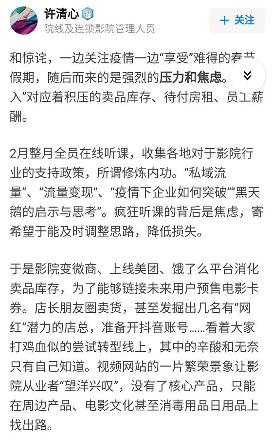 一位知乎认证为“院线及连锁影院管理人员”的网友写道:“2月整月全员在线听课,收集各地对于影院行业的支持政策,所谓修炼内功。”而其所在的影院在消化卖品库存的过程中,甚至开始尝试转型线上:“发掘出几名“网红”潜力的店员,准备开抖音账号。”