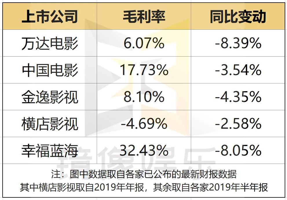 据镜像娱乐统计,除了万达电影之外,中国电影、金逸影视、幸福蓝海、横店影视目前的毛利率同样呈下滑趋势。