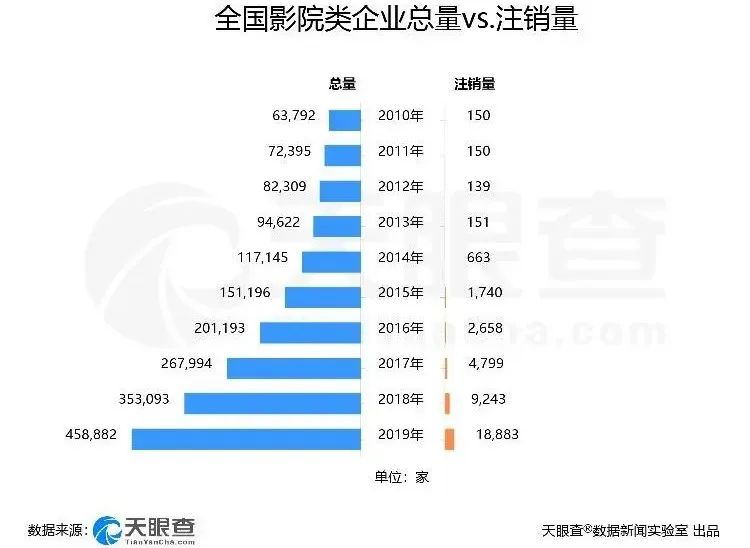 与此同时,影院类企业的注销量也自2012年起逐年攀升,2015年数量明显增多,其中,2019年注销量最高,达1.8万多家。而在2020年,截至3月27日,已经有2263家影院类企业注销。