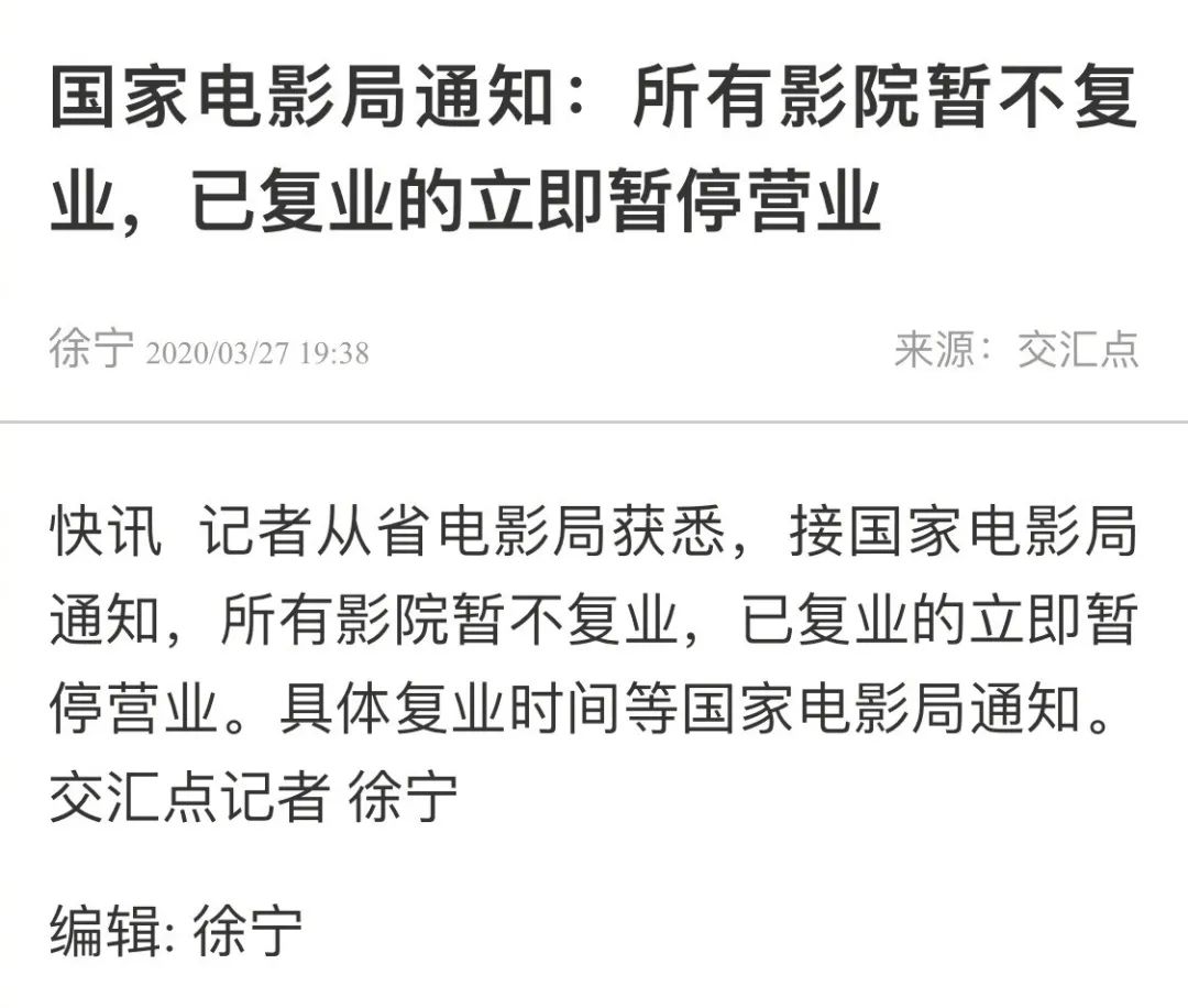 3月27日,新华日报社旗下交汇点新闻从省电影局获悉,接国家电影局通知,所有影院暂不复业,已复业的立即暂停营业,具体复业时间等国家电影局通知。从尝试复工到再度停工,不过隔了十天时间,此前逐步恢复营业的影院,再度全线停摆。
