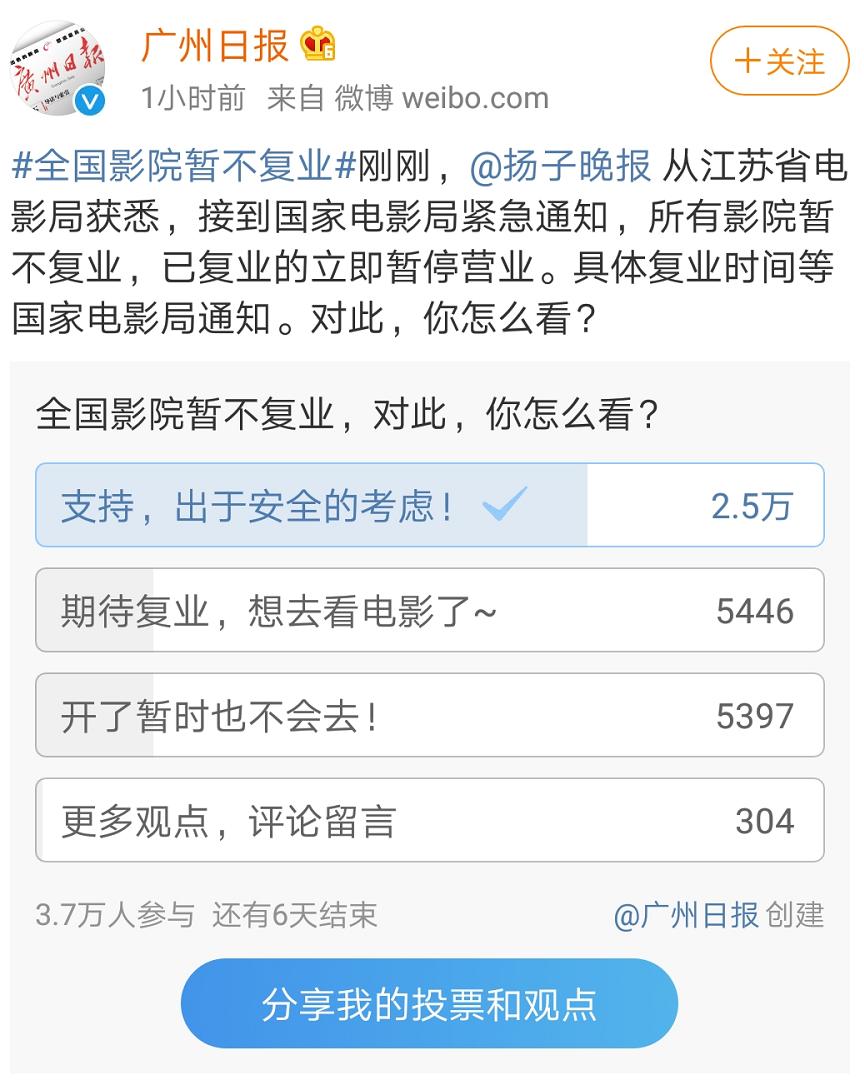 复工之后再停工:80%网友拒绝影院观影