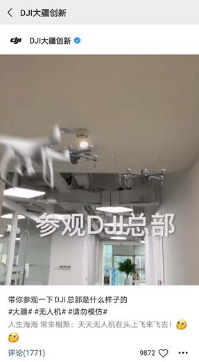 大疆无人机算是中国科技行业里一家传奇但也充满神秘感的公司。大疆公司的视频号推出的第一条视频就是爆款,视频号主题是用无人机角度带大家参观公司本部。用无人机拍摄的角度带大家体验公司环境,既符合公司产品特点,也特别适合视频分享,这一个非常成功的品牌推广案例。