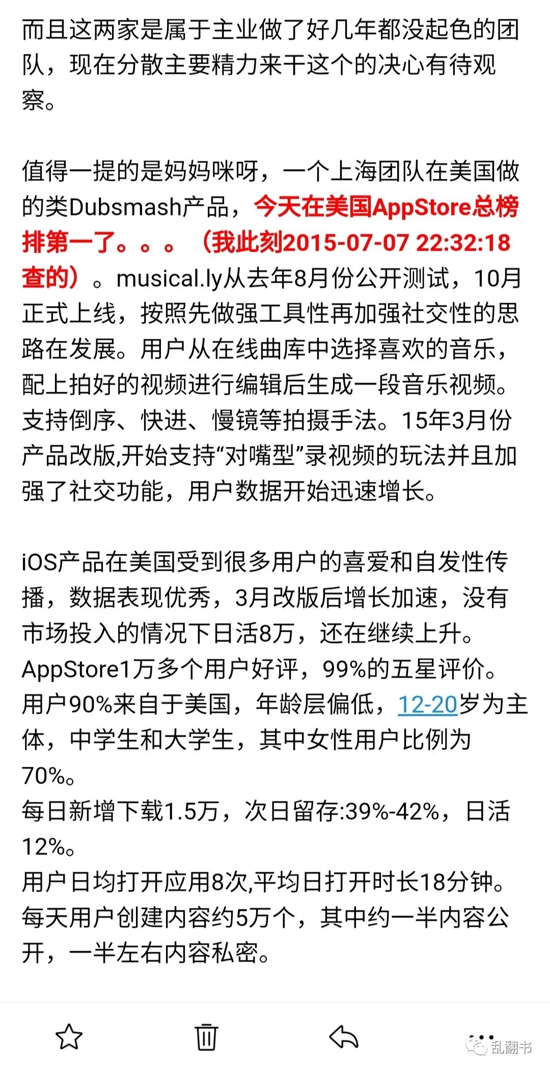 当时我还分析了市场上的三个产品,两个觉得他们很难坚持,觉得产品感觉最好的就是Musical.ly。