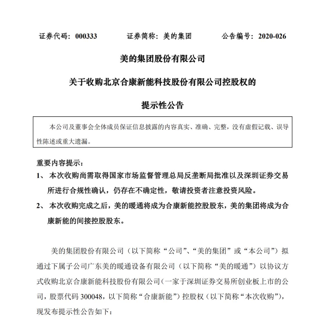 3月25日,美的集团发布《关于收购北京合康新能科技股份有限公司(以下简称合康新能)控股权的提示性公告》(以下简称《公告》)称,公司拟通过下属子公司广东美的暖通设备有限公司(以下简称美的暖通)以协议方式收购合康新能(300048,SZ)控股权。