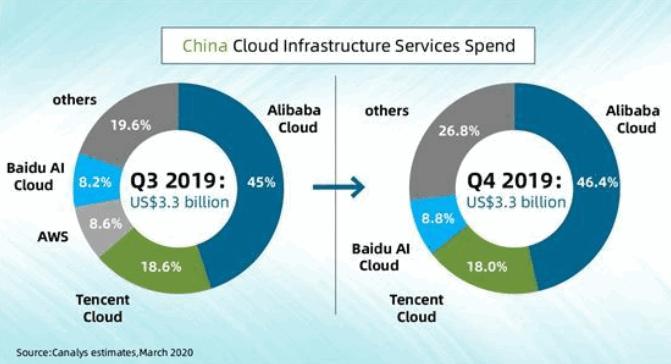 根据调研机构Canalys 3月20日发布的最新报告,2019年第四季度,阿里巴巴在中国云基础设施服务市场的占比为46.4% ,腾讯云占18% ,百度云占8.8% 。可以看出,尽管京东的电商客户有上云的需求,但BAT市场份额目前已超7成,京东之后面临的增长压力不小。
